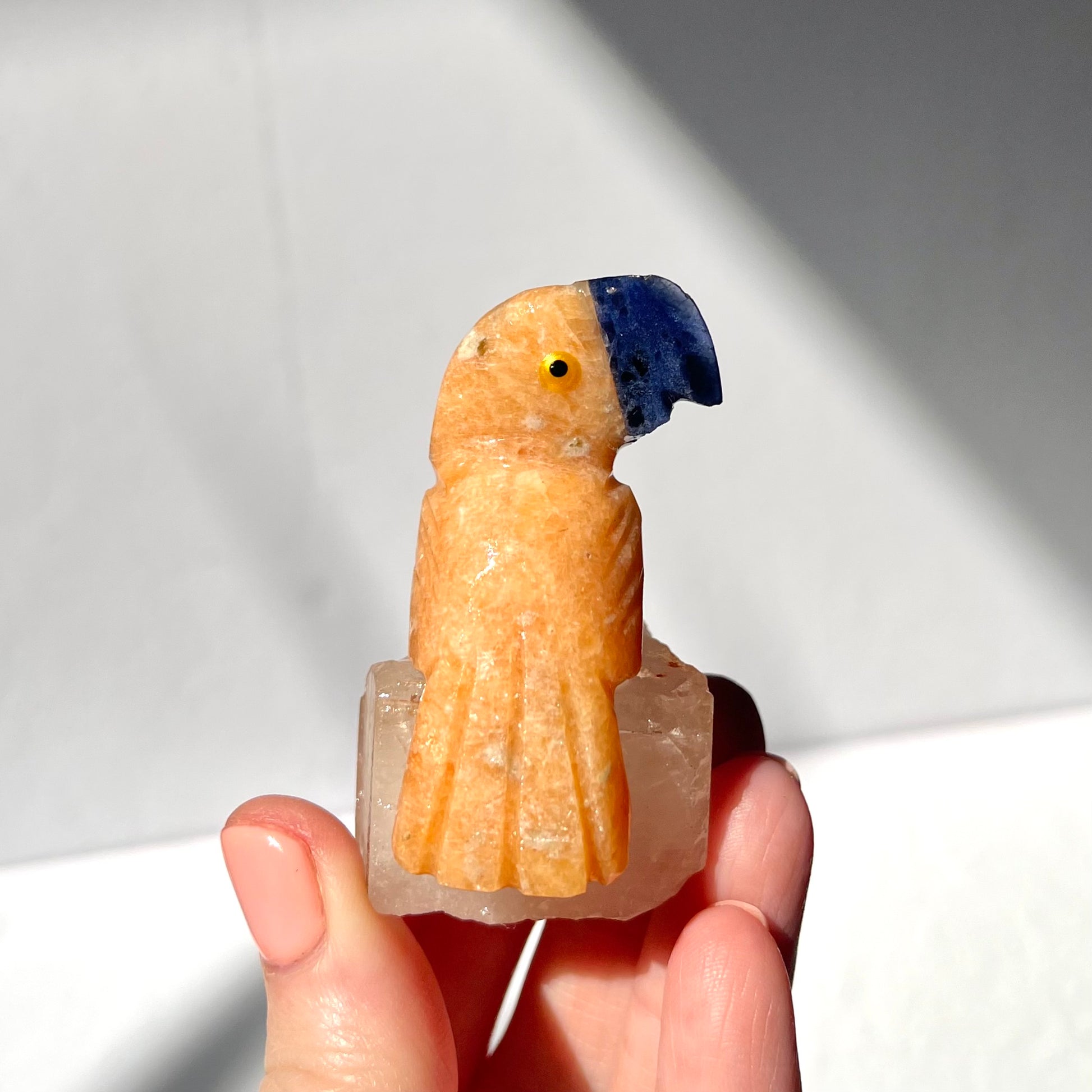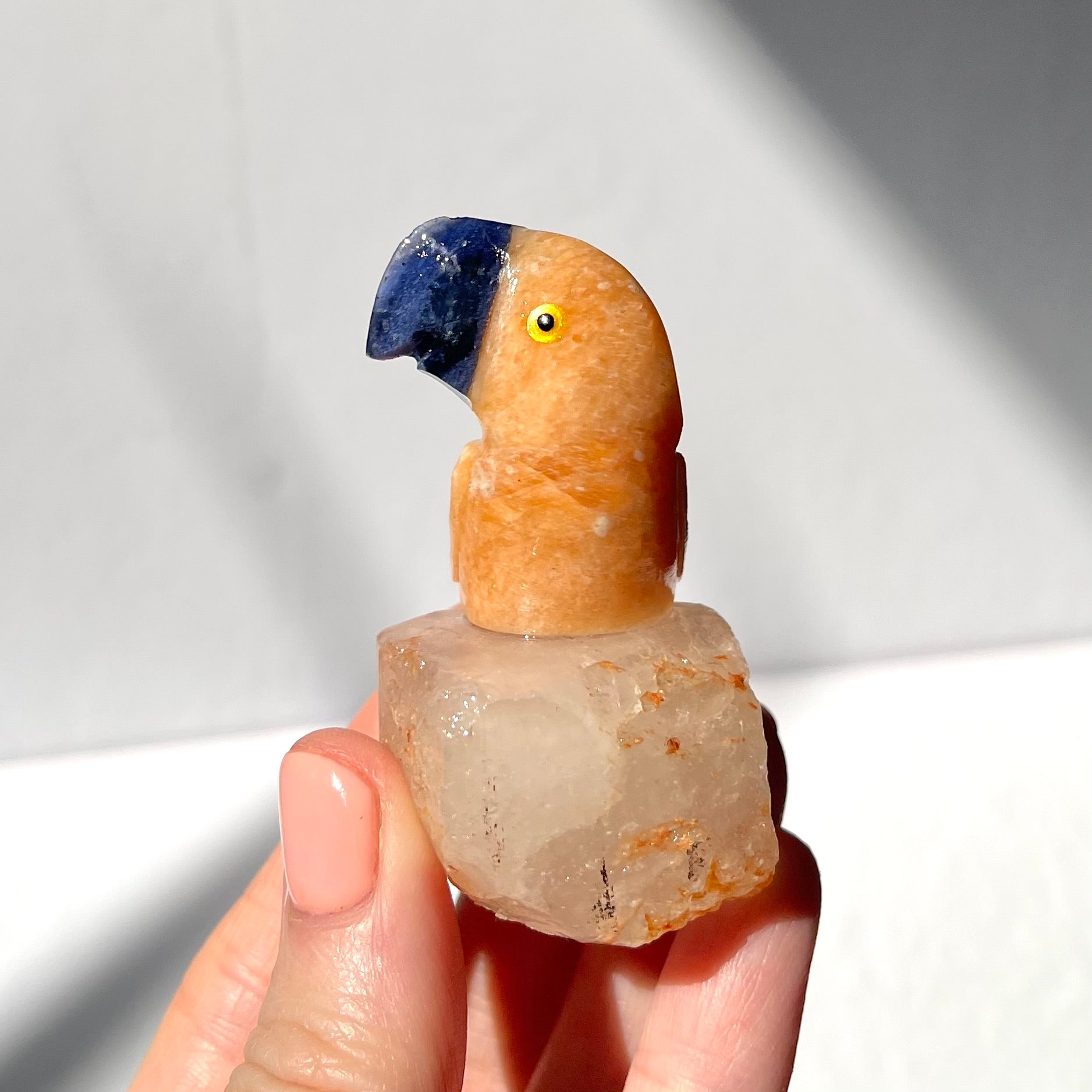 This parrot is made from Sunstone, with a Sodalite beak, perched on a Clear Quartz base.