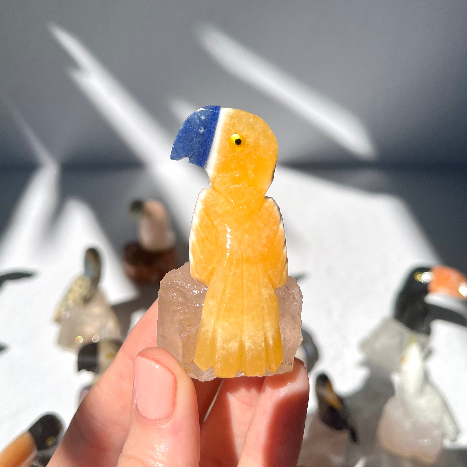 This parrot is made from Orange Calcite, with a Sodalite beak, perched on a Clear Quartz base.