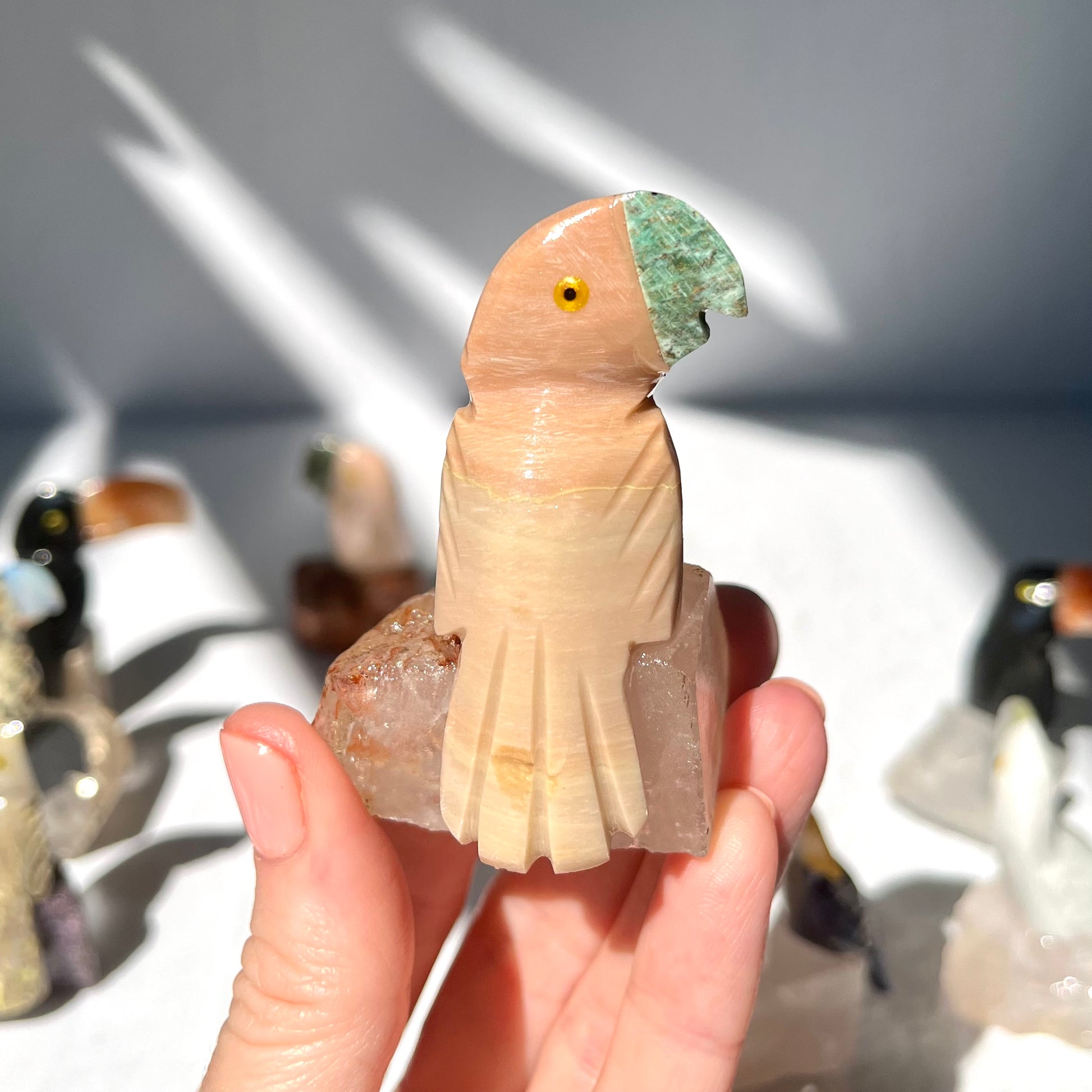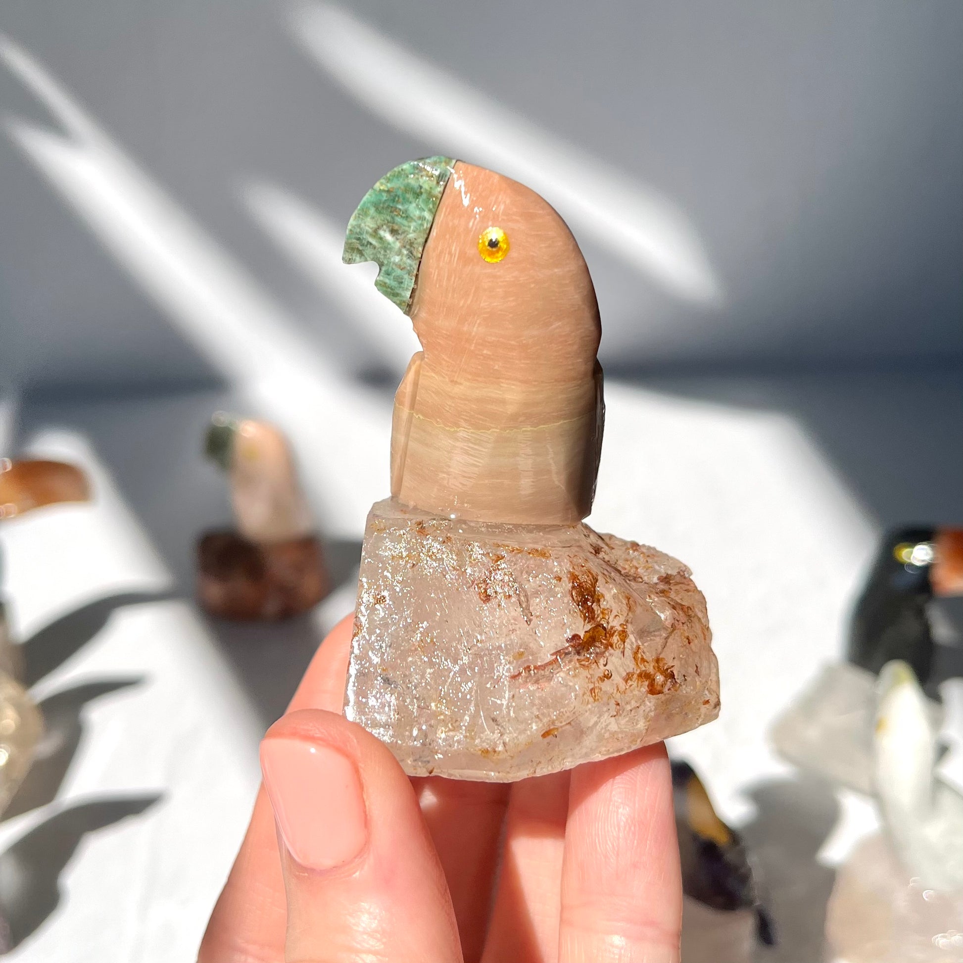 This parrot is made from painted Dolomite, with an Amazonite beak, perched on a Clear Quartz base.