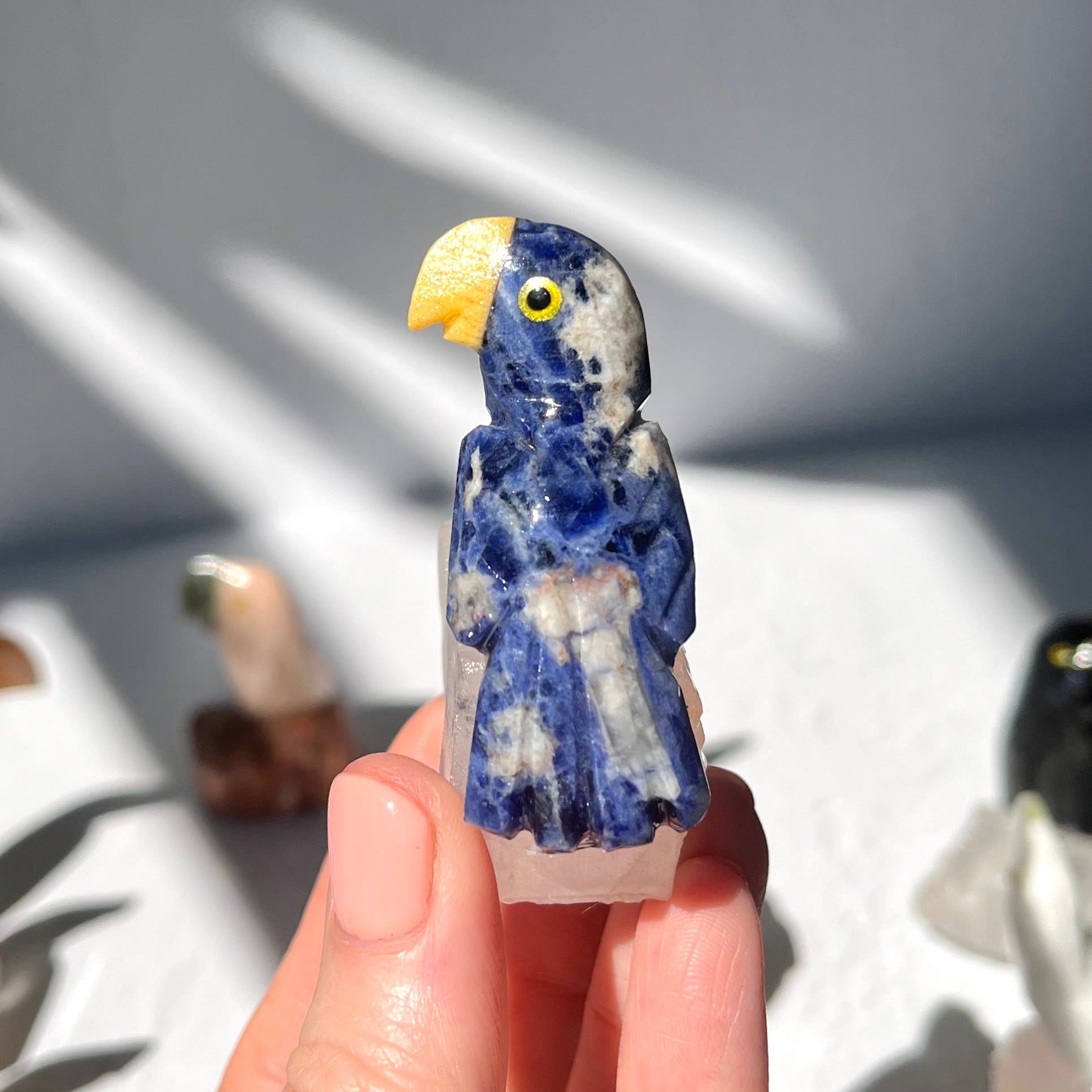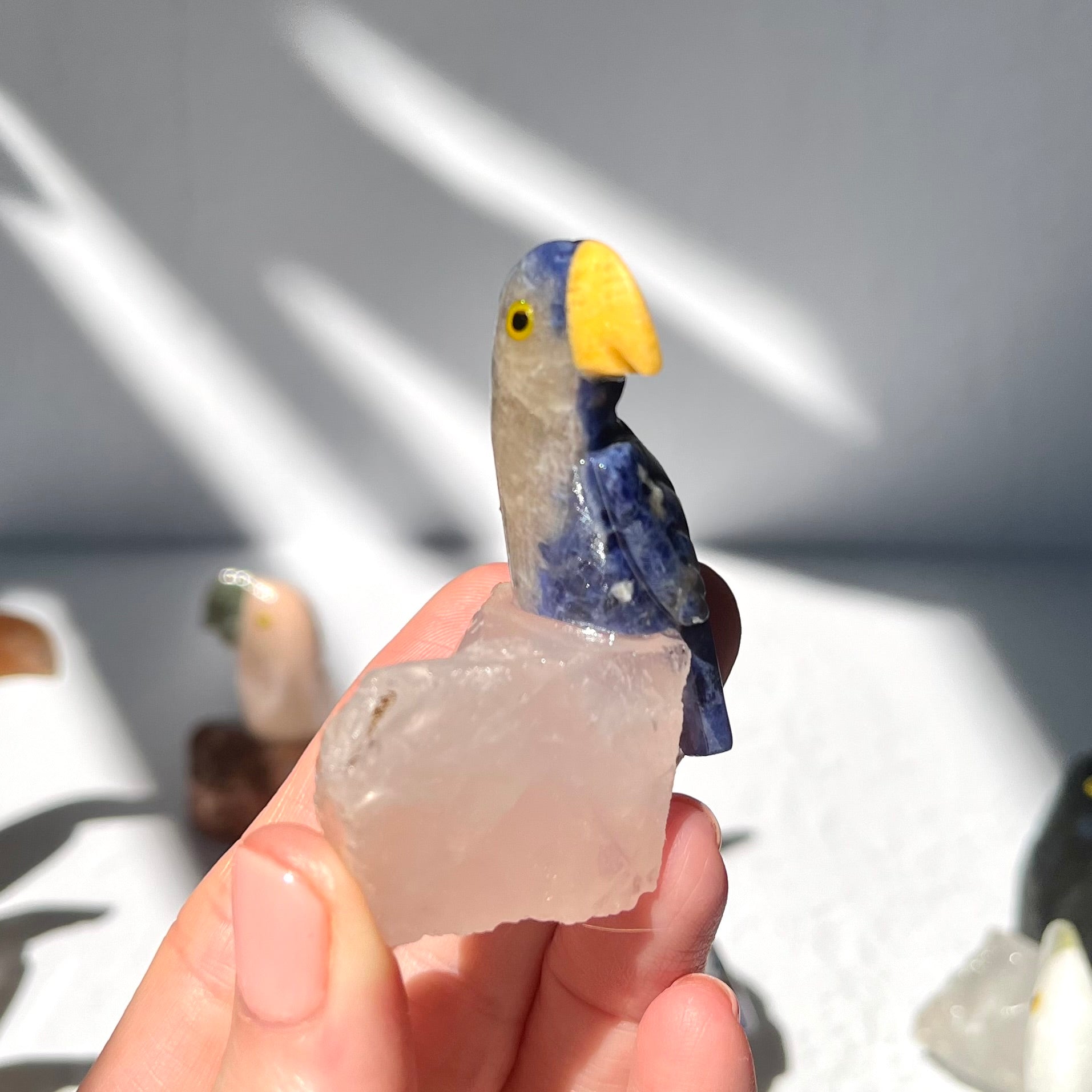 This parrot is made from Sodalite, with an Orange Calcite beak, perched on a Rose Quartz base.
