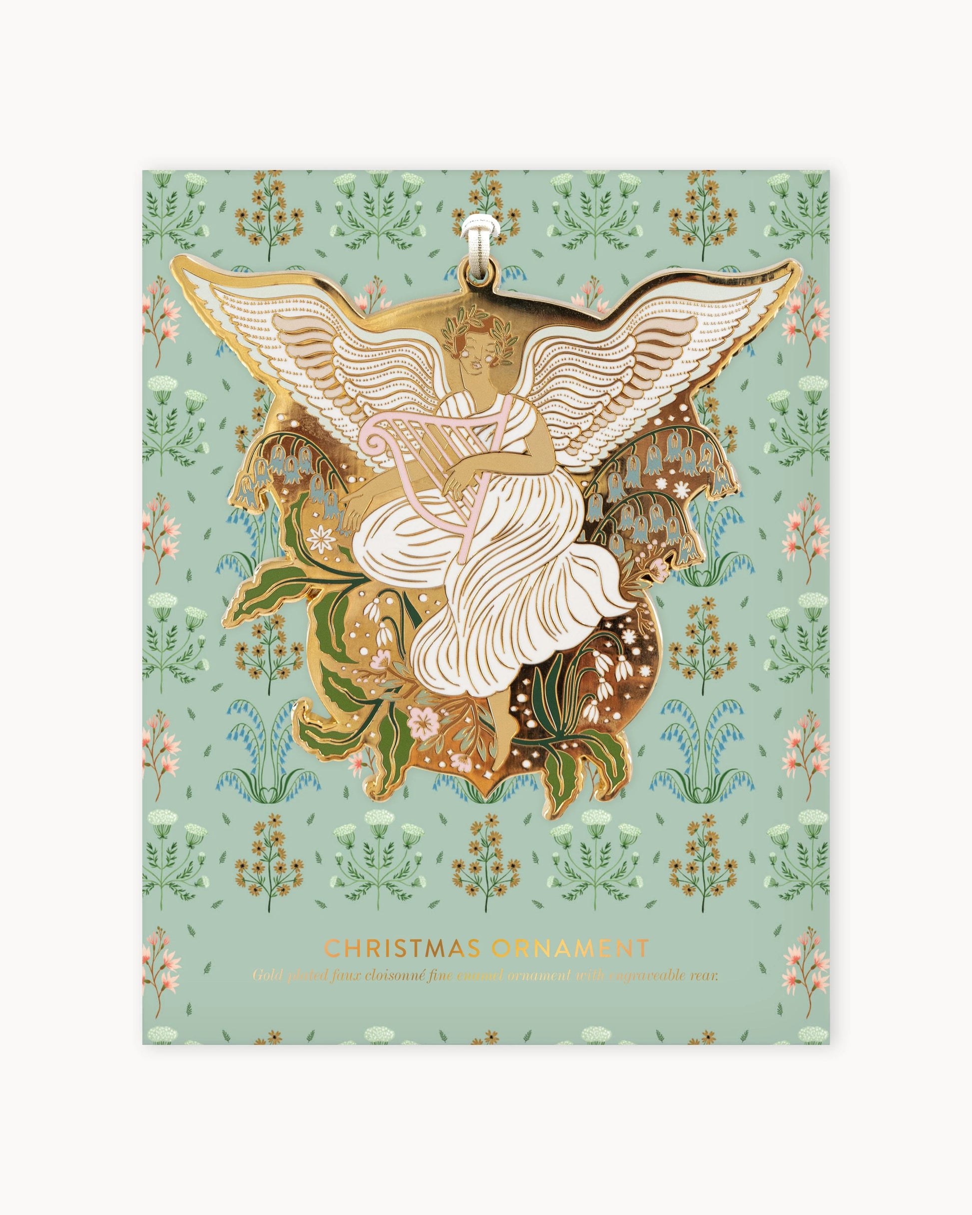 Fine enamel Christmas Angel with Harp ornament, complete with fine gold line ribbon.