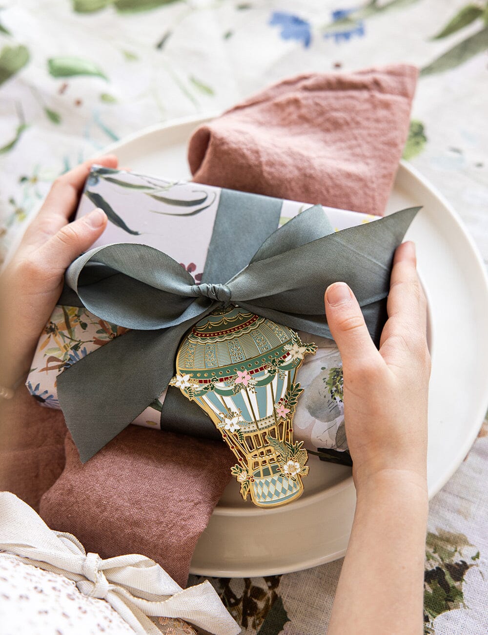 Fine enamel Christmas Hot Air Balloon ornament, complete with fine gold line ribbon.