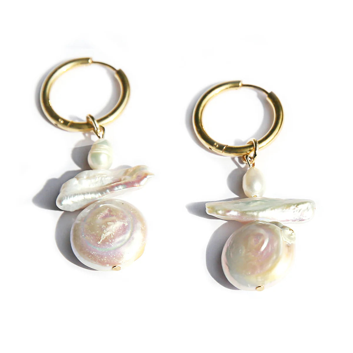Handmade earrings on gold coated surgical steel hoops with Fresh Water Pearls.