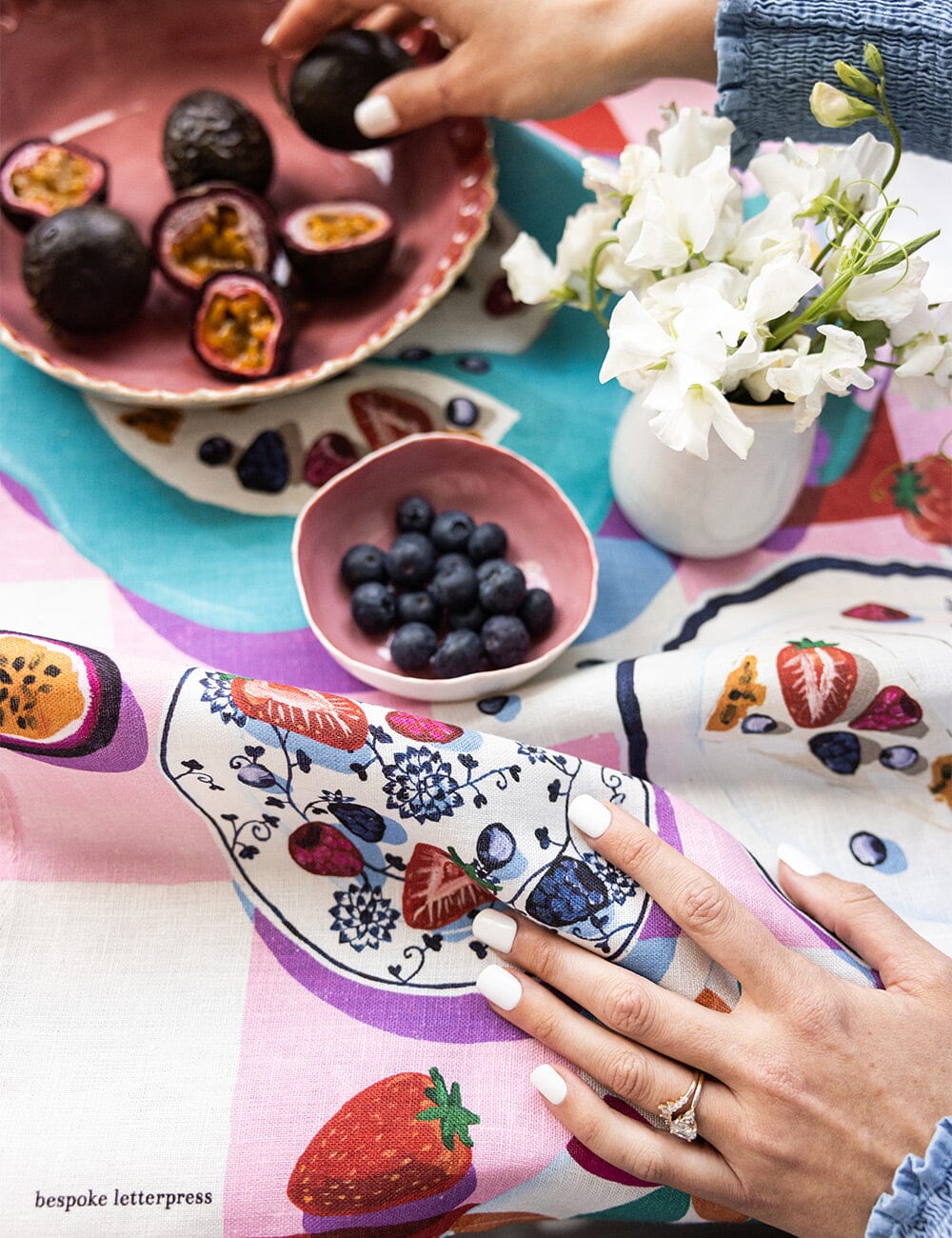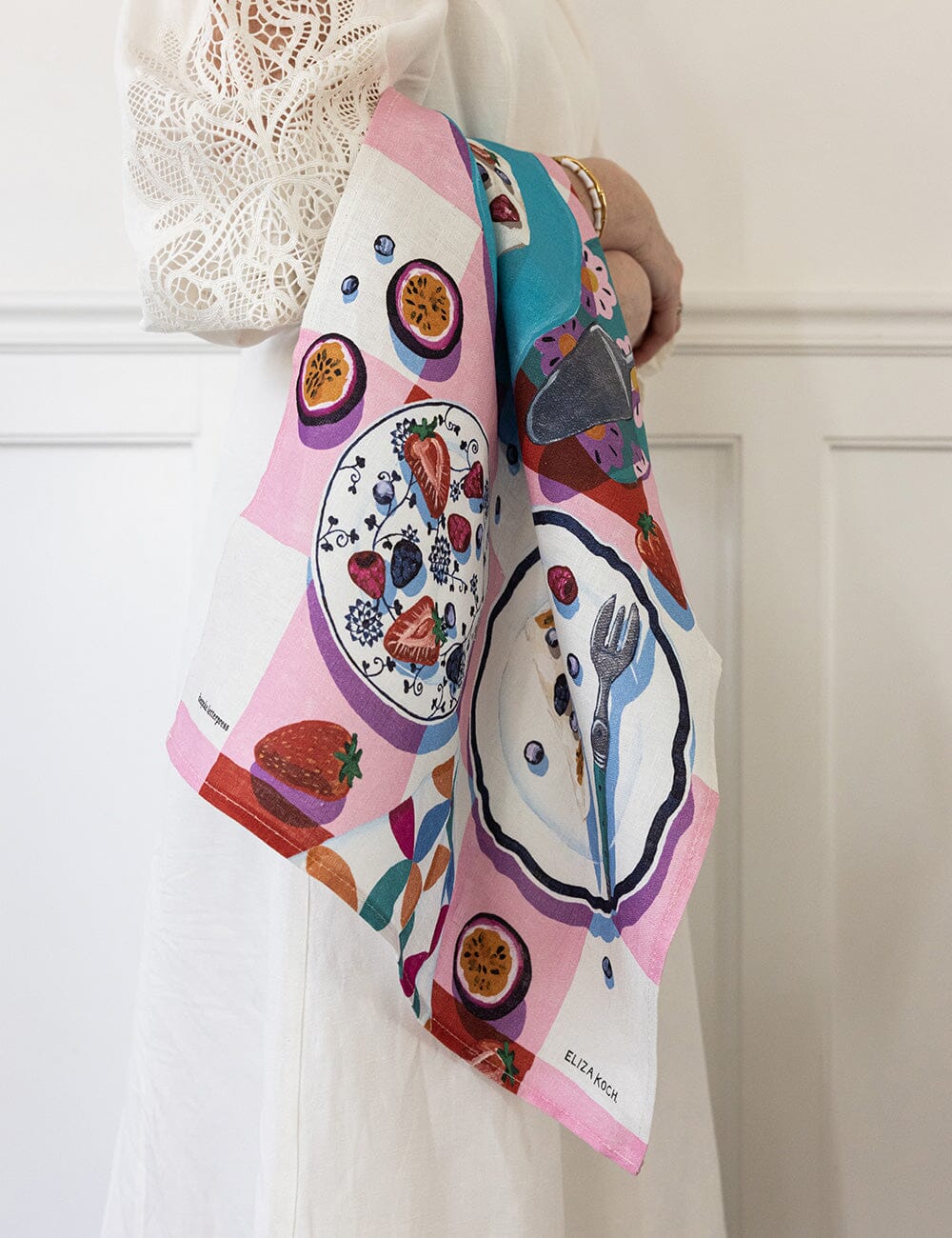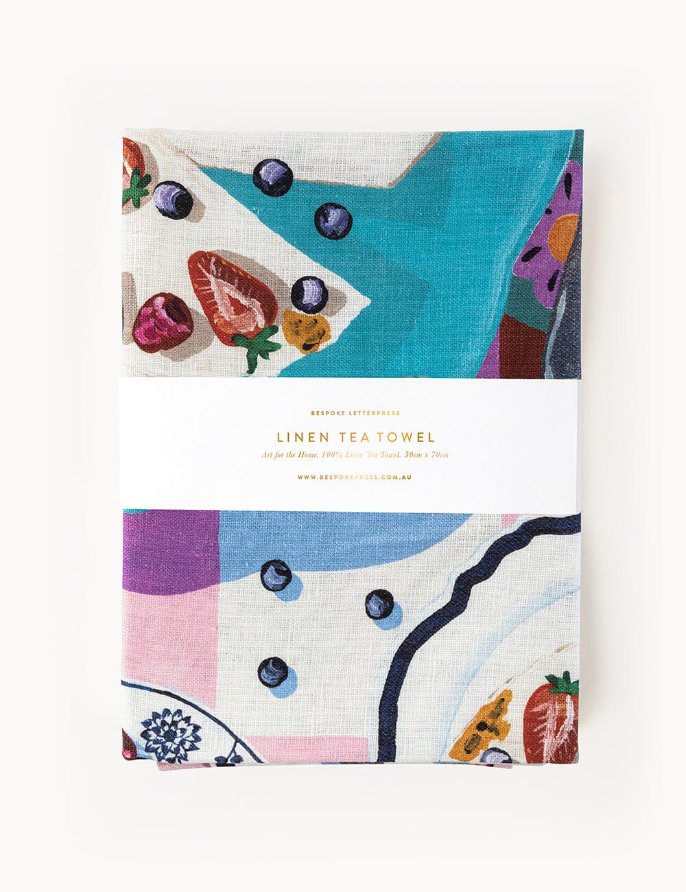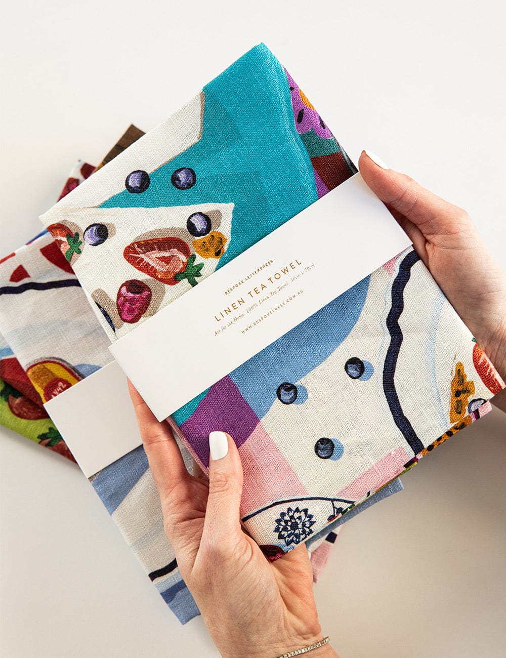 Artwork by Eliza Koch and printed on 100% Linen Tea Towel. Supplied folded with a gold foil printed removable bellyband.