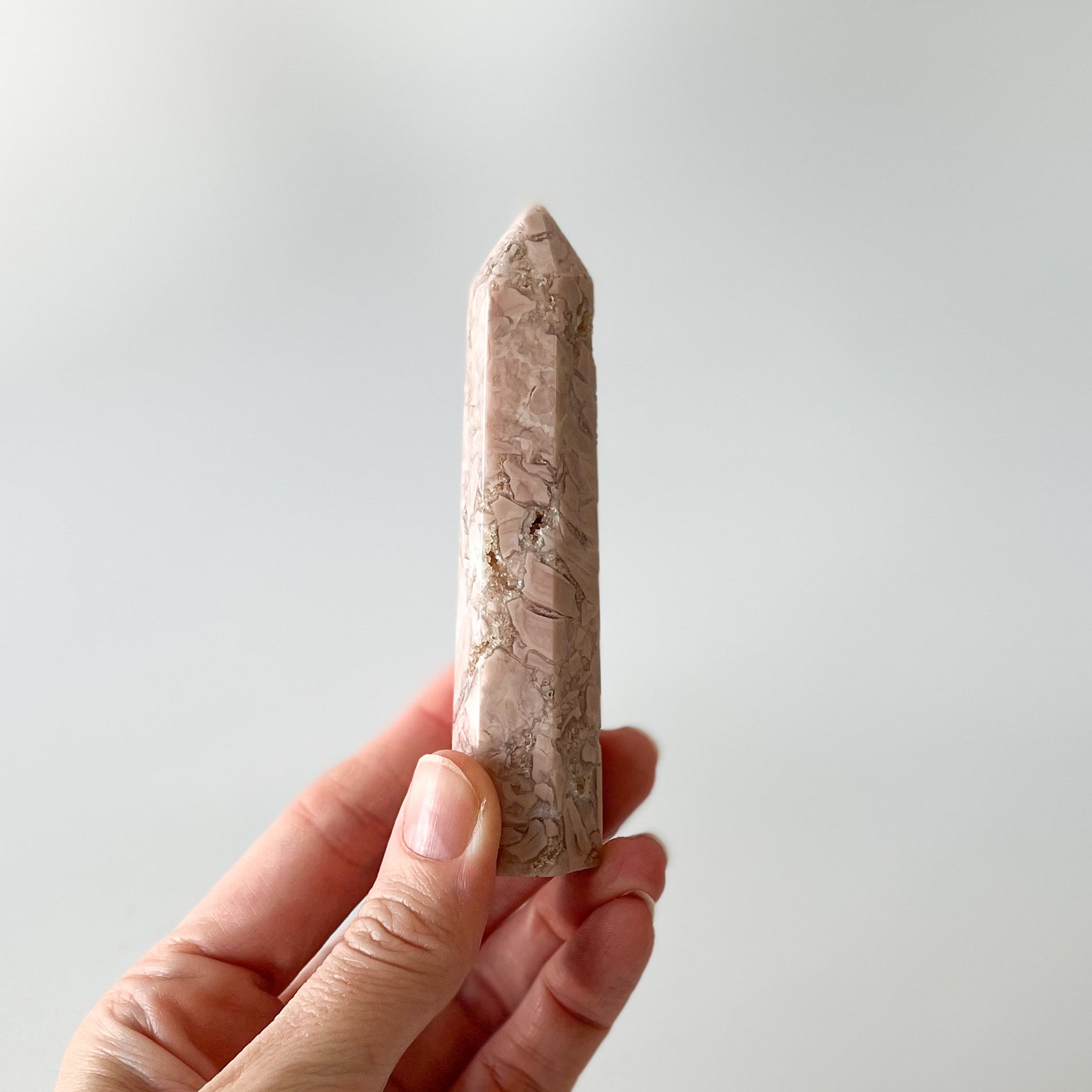 This towed is filled with sparkled quartz veins running through. The softest pink with druzy pockets up and down the point, making this piece so extremely pretty.