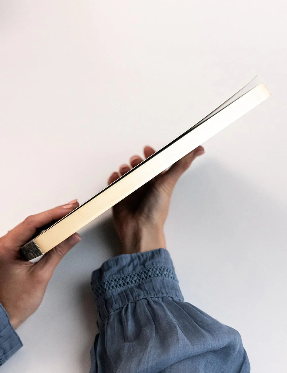 Featuring 100 heavyweight tear off blank pages. Bound with a gummed edge, and full heavyweight wrap around cover. Removable Gold Foil printed Bellyband and gold foil and gilded edges.
